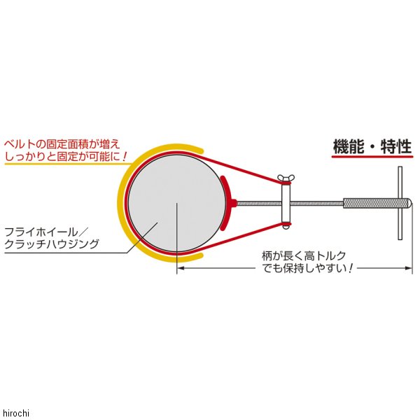 キタコ フライホイール&プーリーホルダー【仕様説明】Φ160まで固定可能なロングタイプ。各部回り止め用フライホイールやドライブフェイス、クラッチアウター等の脱着時に必要な工具です。付属のシャフトを使用して締め付ける事で無理なく確実に固定できます。また径の小さい物はバンドの調整穴を移動させることにより固定可能です。Φ75~Φ160程度まで使用可能。