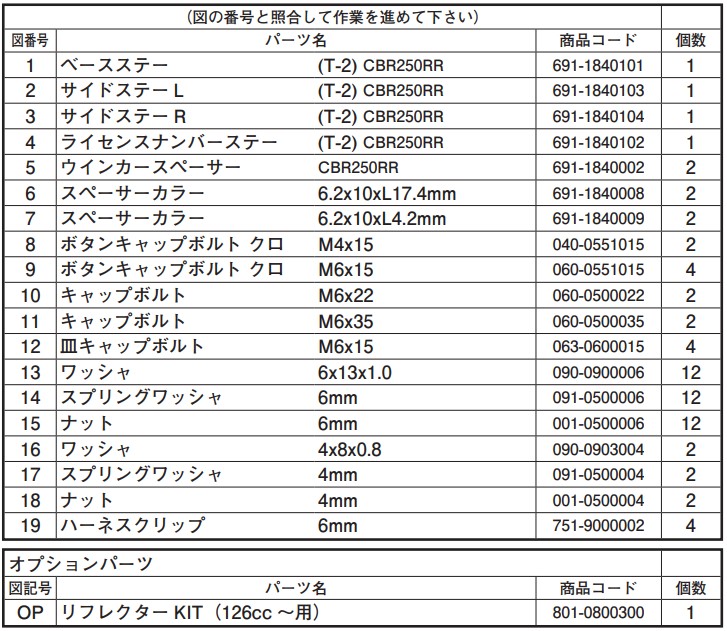 キタコ フェンダーレスキット17年-22年 ホンダ CBR250RR適合型式:MC51カラー:ブラック仕上げ【素材】スチール【仕様説明】・ボルトオン・取付ボルト、カラー類付属・ノーマルライセンス照明使用・ノーマルウインカー使用・2021年度ナンバープレート新基準適合品・テール周りをフェンダーの無いすっきりしたスタイルに。※別途リフレクターKITが必要です。※ノーマルフェンダーにあるフックプレート(2ヶ所)は無くなります。