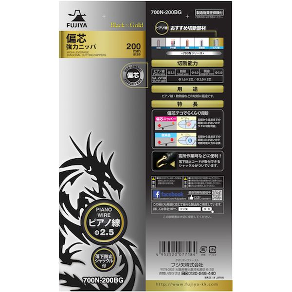 ・偏芯テコ機能で従来製品よりも楽に切断できます。・落下防止コードが取付けできるシャックルが付いています。・圧着機能付きです。・ピアノ線などの硬線や銅線、VA線の切断用。・全長(mm):208・刃表面形状:強力刃・切断能力(mm)VA線:φ2.0×3芯・切断能力(mm)鉄線:φ4.0・切断能力(mm)銅線:φ5.0・切断能力(mm)VVF線:2.0×3芯・切断能力(mm)ピアノ線:φ2.5・ばね:無・落下防止用ひも取付穴:有・厚刃・簡易圧着機能付き・落下防止コード取り付け可能・偏芯機能・特殊鋼・グリップ:樹脂・本来の目的以外では使用しないでください。・作業時は周りの安全を確かめてご使用ください。・保護メガネ等を着用して作業をしてください。・能力以上の使用はしないでください。・生産国 日本・JANコード 4952520077184・質量 330g・コード:120-8538 ・品目:700N200BG