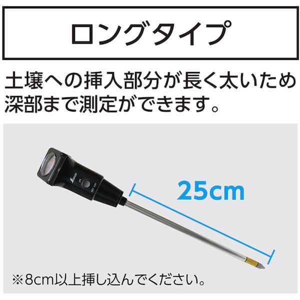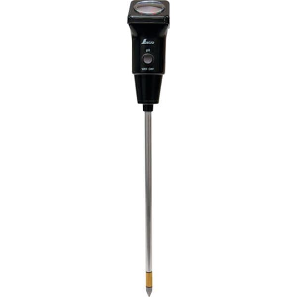 ・土壌酸度測定時の適切な水分状態を確認できるコンディションチェック機能付です。・土壌への挿入部分が長く太いため、深部まで測定ができます。・土壌に垂直に挿し込んだ時、読み取り安い角度のメーターです。・測定範囲(pH):pH3~7・1目盛(pH):pH0.2・幅(mm):55・奥行(mm):395・高さ(mm):55・本体・メーターカバー:ABS樹脂・メーター:アルミ・電極部:チタン亜鉛合金、銅、アルミ、ゴム・サンドペーパー(#1000)・土壌が適度な水分を含んでいないと、正確なpHを測れません。・電極部が汚れていると正確な測定ができないので、使用前に番手の細かいサンドペーパーで磨いてください。・生産国 中国・JANコード 4960910727953・質量 97g・コード:423-8581 ・品目:72795