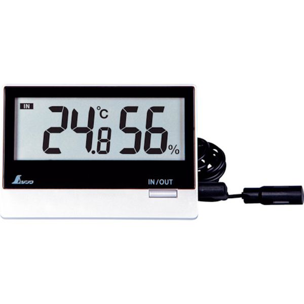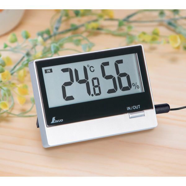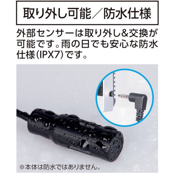 ・スタンドで置き型に、フック穴で壁掛けにできます。・広い視野角で明るさ、映り込みにくさ、フォントにこだわりました。・外部センサー付で室内・室外の温度・湿度が測定できます。・外部センサー付で室内・室外の温度・湿度が測定できます。・測定温度範囲(℃):本体側:-5~50、外部センサーー10~70・温度最小表示(℃):0.1・測定湿度範囲(%RH):30%~95%・幅(mm):102・奥行(mm):18・高さ(mm):70・電源(V):単4電池×1本・色:シルバー・電源:単4電池×1本・測定間隔10秒・外部センサーIPX7・本体:ABS樹脂・外部センサー:真鍮・塩化ビニル樹脂・生産国 中国・JANコード 4960910731196・質量 125g・コード:431-7016 ・品目:73119