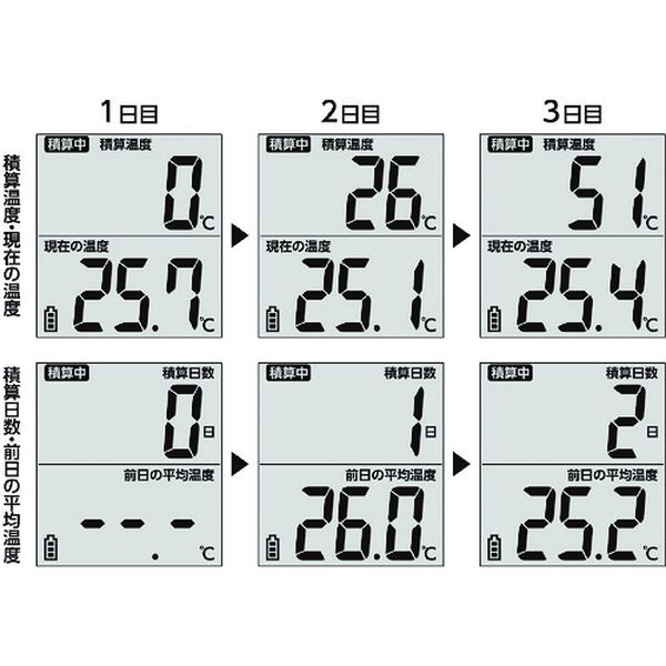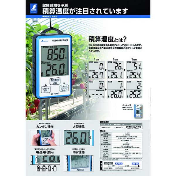 ・読み取りやすい大型液晶です。・電池切れのタイミングが分かる電池消耗表示付です。・水がかかっても安心の防水仕様です。(IPX4)・日々の平均気温の合計をある期間にわたって測定すること(積算温度)で、農作物の適切な収穫時期の目安を確認することができます。・測定温度範囲(℃):-5~50℃・温度最小表示(℃):0.1℃(積算温度1度)・幅(mm):68・奥行(mm):125・高さ(mm):28・積算温度計測範囲:0~9999℃・精度0~50℃:±1℃それ以外±2℃・測定間隔1分・積算温度更新間隔24時間間隔・防水性能IPX4・本体:ABS樹脂・液晶カバー:ポリカーボネート樹脂・液晶:ガラス・スタート・ストップボタンを押した最初の午前0時から積算が開始され、翌日午前0時に平均温度が積算温度に加算されます。・生産国 中国・JANコード 4960910734807・質量 180g・コード:286-9078 ・品目:73480