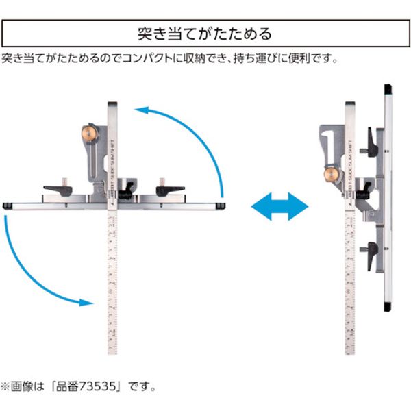 ・突き当てがたためるのでコンパクトに収納でき、持ち運びに便利です。・ネジをスリットに沿って直角固定位置に固定するだけで90°になります。・ワンタッチで薄板切りと細切りの切り替えができます。・突き当てを起こすことで薄板が入り込まずに切断できます。・また、突き当てを倒すことで細切りが可能になります。・9mmボードを重ねた状態で切断するのに適した突き当ての高さで、2枚目の材料に干渉しません。・竿はサビにくく、曲がりにくいステンレス製(SUS304)です。・作業に合わせて突き当ての位置を調整できます。・全長(mm):610・幅(mm):275・厚さ(mm):20・呼び寸法(mm):450・突き当て高さ 薄板モード:15mm 細切モード:9mm・材質 竿、結合部:ステンレス 突き当て:アルミ、UHPEテープ ストッパーネジ:ステンレス、真ちゅう 保護キャップ:ポリカーボネート樹脂 ワンタッチレバー、止ネジ(ブレ防止金具部):ポリアセタール樹脂・本体サイズ 610×275×20mm(たたんだ時 巾89mm)・製品質量 364g・生産国 日本・JANコード 4960910735361・質量 364g・コード:580-5516 ・品目:73536