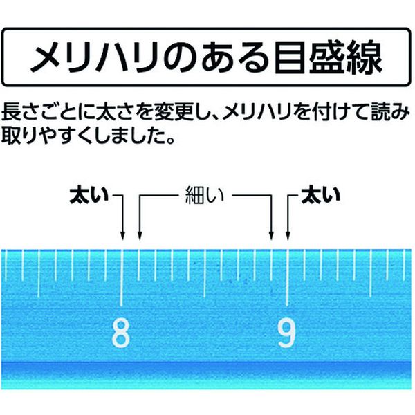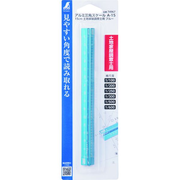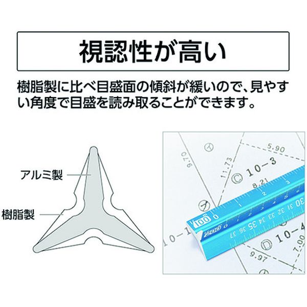 ・目盛線を長さごとに太さを変更し、読み取りやすくしました。・アルミ製で薄型形状なので、目盛が見やすくなっています。・レーザー刻印で、印刷に比べて目盛が消えにくく長持ちします。・地積測量図や建築平面図など、登記手続きに必要な図面作成、読み取りに便利です。・図面の作成、読み取りに使用。・全長(mm):170・幅(mm):16・厚さ(mm):16・呼び寸法(mm):150・色:青・土地家屋調査士用・長さの許容差:±0.12mm・アルミ・生産国 日本・JANコード 4960910749672・質量 25g・コード:243-0581 ・品目:74967
