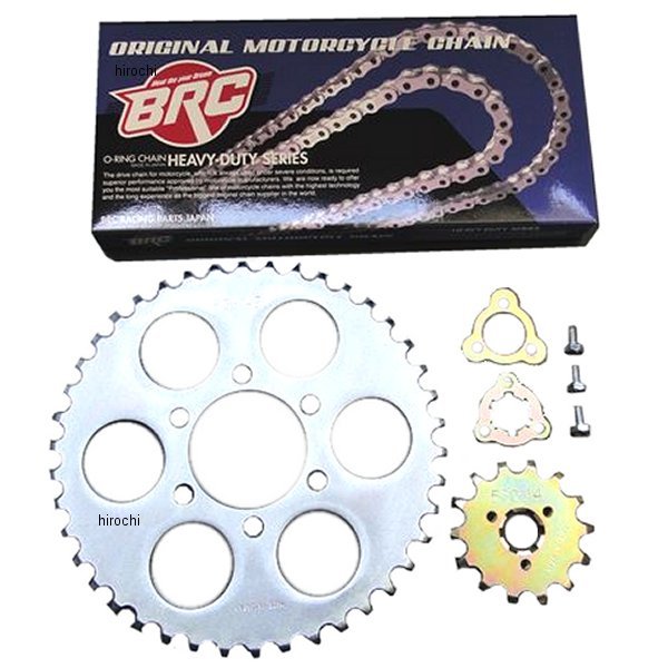 ビーアールシー BRC スチールスプロケ&シルバーチェーン 530サイズキット70年-77年 スズキ GT380全機種 (逆車にも対応可)フロント:530/14Tリア:530/42Tチェーンサイズ:530/110L ※ノーマルは104リンクですのでカットしてからご使用下さい。チェーンは給油の要らないオーリングチェーンで安心の日本製です。スプロケは鉄製の「ユニクロメッキ仕上げ」となります。アルミ製に比べ10倍の耐久性があります。このチェーンは強化オーリングチェーンですのでピンは通常より太く強化しておりますので伸びにくく錆びないようにブラックコーテイングしておりますので安心です。装着例はチェーンの色をわかりやすくするためスプロケはアルミ製ですが商品は鉄製です。※メーカー欠品の場合、長期納期となります。ご了承ください。
