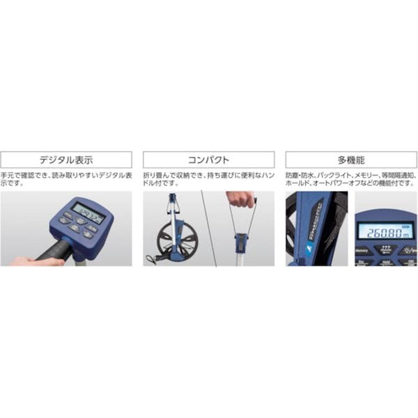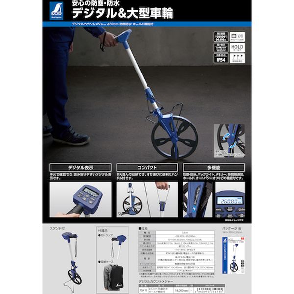 ・車輪が大きいため安定した測定ができます。・アナログタイプよりも読み取りやすい、バックライト機能付の大型・大文字・手元ディスプレイです。・メモリー機能で測定値を100件まで保存可能です。・測定値をホールドし、液晶の見えにくい状況でも数値が確認できます。・設定した距離毎に音で知らせる等間隔通知機能付です。・持ち運びしやすく、コンパクトに収納できる、折り畳み式です。・防塵・防水性能IP54です。・オートパワーオフ機能付です。・滑りにくく握りやすいハンドルです。・収納ケースとストラップ付です。・測定範囲:-99,999~99,999m・縮長~全長(mm):510~980・車輪径 32cm・測定範囲 -99999~99999m・許容差 0~10m:±0.05m、10m以上:±0.5%・最小表示 1km未満:0.01m、1km以上10km未満:0.1m10km以上:1m・表示単位 m・カウント検出方式 磁力センサー・メモリー機能 100件・等間隔通知 設定可能範囲:0.01~9999.99m・使用温湿度 -10~60℃、95%以下・防塵・防水性能 IP54※(折り畳み部、電池ケース内部を除く)※防塵性能:粉塵が内部に侵入することを防止します。・生産国 中国・JANコード 4960910754195・質量 2000g・コード:459-4455 ・品目:75419