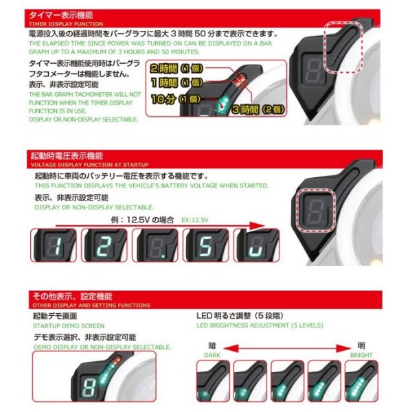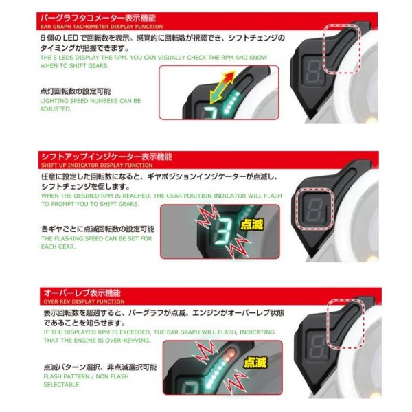 キタコ ギアポジションインジケーターホンダ モンキー125 JB02全車種 ※国内仕様車のみ適合インジケーター本体:アルミ削り出し・ブラックアルマイト仕上げキタコ製5速クロスミッションASSY(廃番)使用可ギヤポジションインジケーターに加え、8 個のLED を使用したLEDバーグラフタコメーターとシフトアップインジケーターを組み合わせた、純正スピードメーターに違和感なく装着できる多機能インジケーター。ライダーに現在のギヤ位置とエンジンの回転数を視覚的に表示することで、運転操作の正確さと安全性を向上させます。【主な機能】・ギヤポジションインジケーター:接点式ギヤポジションセンサーにより、1速~最大5速までの表示が可能。瞬時に何速に入っているかを表示します。・シフトアップインジケーター:ギヤポジションインジケーターが点滅し、シフトチェンジを促します。・バーグラフタコメーター:8個のLEDで回転数を表示、感覚的に回転数が視認できます。機能設定について・LED輝度設定機能:5段階のLEDの輝度調節が可能。(1段階の輝度がデフォルト設定)・ピックアップパルス設定:車種に応じた回転数パルス(9パルスもしくは34パルス)を変更する事が可能。(出荷時車種別に設定済)・バーグラフタコメーター回転数設定:バーグラフタコメーターの点灯回転数が設定可能。1000rpmスタート・1000rpmステップ(デフォルト設定)3000rpmスタート・1000rpmステップ2500rpmスタート・500rpmステップ・バーグラフタコメーターオーバーレブ点滅設定:表示回転数を超過すると、バーグラフが点滅。点滅無しバーグラフの赤色のみ点滅(デフォルト設定)バーグラフの全てが点滅・シフトアップインジケーター点滅設定:ギヤポジションインジケーターの点滅回転数を各ギヤごとに設定可能。点滅無し点滅、全ギヤ共通回転数(デフォルト設定)点滅、各ギヤごとの回転数、任意に10000、1000、100rpmの単位で設定可能【その他の機能】・起動時デモ設定:電源投入時のデモ動作が選択できます。表示無しデモ1(デフォルト設定)デモ2・起動時電圧表示機能:起動時に車両電圧を表示する機能です。表示無し表示有り(デフォルト設定)・タイマー表示機能:電源投入後の経過時間をバーグラフに最大3時間50分表示できます。LED1~5 緑ランプ(1セグあたり10分)LED6 赤ランプ(1時間経過)LED7 赤ランプ(2時間経過)LED7/8 赤ランプ(3時間経過)※タイマー表示機能使用時はバーグラフタコメーターは機能しません。