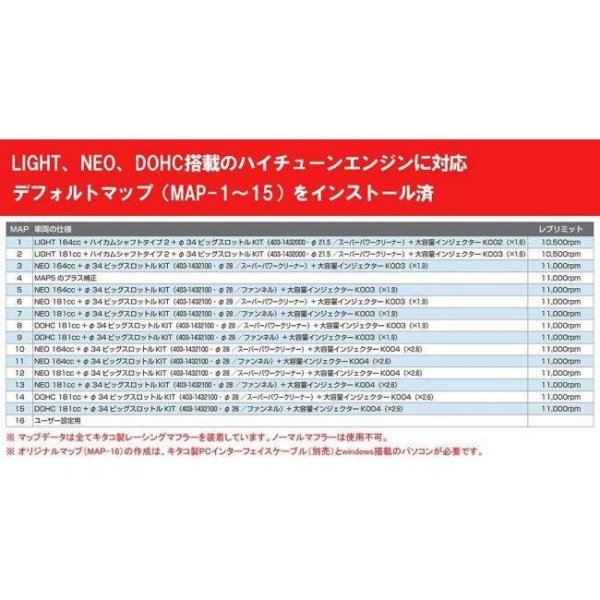 キタコ I-MAP カプラーオン バージョン4 グロム GROM/JC61※グロム(JC75)は使用不可。タイプ:バージョン4配線加工不要の専用ハーネス付I-MAP。ハイコンプ125cc、LIGHTを中心としたライトチューンエンジンに対応。カプラーオンセットは配線加工不要の専用ハーネスが付属しています。オリジナルマップの作成は別途PCインターフェイスケーブル(キタコ品番:763-0500900)とwindows搭載のパソコンが必要です。