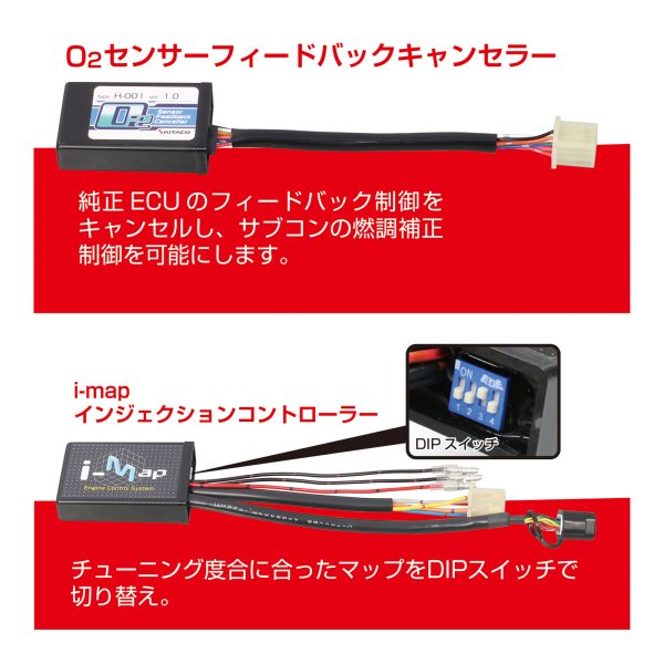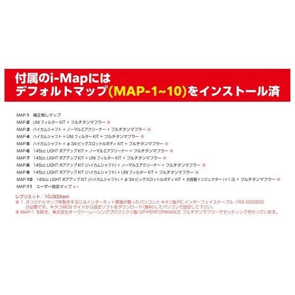 キタコ I-MAPフィードバックキャンセラーセット21年-22年 ホンダ グロム・配線加工不要・O2フィードバックキャンセラー付属・車種専用カプラーオンハーネス付属燃料噴射量を補正するFIコントローラーです。キタコ製パーツの組み合わせに対応する複数の最適マップをインストール済みで、ユーザーはI-MAPを取り付けた後、スイッチの設定でマップを選択します。(マップ数は車種により異なります。)また、キタコ製以外のパーツの装着やユーザーの好みに対応させるため、ユーザーオリジナルマップの作成も可能です。オリジナルマップの作成は別途PCインターフェイスケーブル(763-0500900)とwindows搭載のパソコンが必要です。新基準の排ガス規制対応車にも安定してI-MAPを作動させるO2フィードバックキャンセラーを付属。