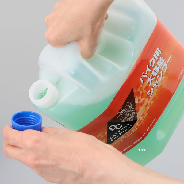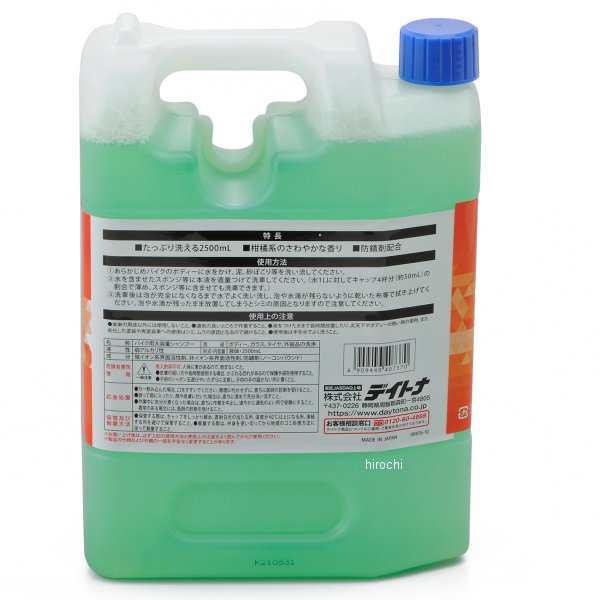 無着色・防錆剤配合・大容量シャンプー。バイクのボディにやさしい。容器にグリップ部に凹みを入れることで握りやすい。・お得な2500mlの大容量シャンプー。水1lに対してシャンプー50mlの割合でご使用ください。・塗装色適合:全色対応・緑色・液性:弱アルカリ性・成分:イオン系界面活性剤、防錆剤(ノーコンパウンド)