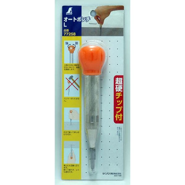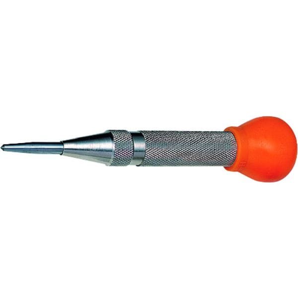 ・片手で押し付けるだけで、楽に印が付けられます。・ハンマーが要らないので、天井にも正確に打てます。・鉄板等のドリル作業の下地加工、点のケガキ・全長(mm):160・オートポンチL・本体:真鍮・メッキ・先端部:超硬チップ・先端は鋭利で危険です。・取り扱いには十分注意して下さい。・生産国 日本・JANコード 4960910772588・質量 181g・コード:158-9905 ・品目:77258
