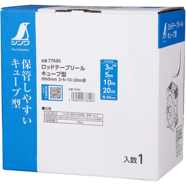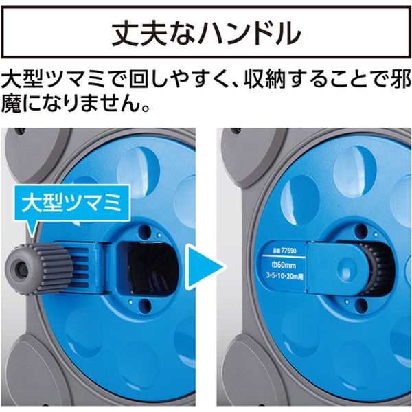・リールのハンドルは、左右どちらも取付可能で収納可能です。・ハンドルが収納できるので不意の落下時に破損しにくい、積み重ねて収納できます。・地面に置いたまま巻取りできます。・テープはワンタッチで着脱可能です。・現場撮影時の基準に。・幅(mm):194・奥行(mm):121・高さ(mm):202・テープ取付可能サイズ:巾:60mm、長さ:3・5・10・20m用・ハンドル、板面:ABS樹脂 ・軸棒:アルミ・用途以外に使用しないでください。・生産国 日本・JANコード 4960910776906・質量 960g・コード:713-1998 ・品目:77690