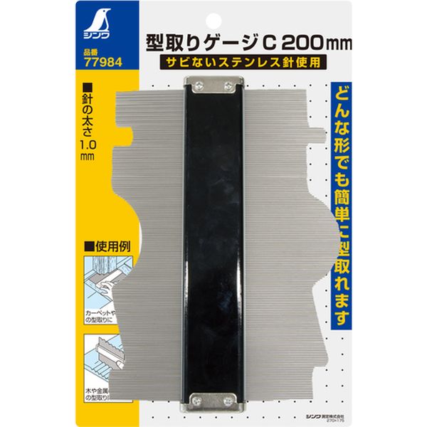 ・どんな形でも簡単に型取れます。・サビないステンレス針を使用しています。・カーペット、敷物、木、金属部の型取りに。・使用針:約195本・使用範囲(幅×奥行):約190×81mm・寸法(mm):203×120×22・針:ステンレス・生産国 日本・JANコード 4960910779846・質量 465g・コード:147-7616 ・品目:77984