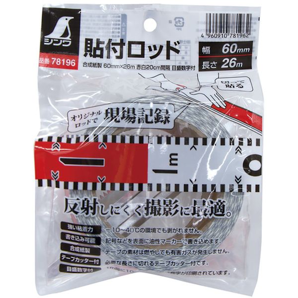 ・簡単に切って貼るだけでオリジナルのロッドが作れます。・反射防止加工。反射しにくく撮影時にくっきり写ります。・夏場、冬場でも安心で、-10から40℃の環境でも剥がれません。・油性マーカーで書き込めます。・裏面糊付のロッドテープです。・端材などに貼り付けてオリジナルのロッドが作れます。・全長(mm):26000・幅(mm):60・厚さ(mm):0.15・テープ:合成紙・カッター:スチール・テープカッター・テープカッターのお取扱いにはご注意ください。・生産国 中国・JANコード 4960910781962・質量 250g・コード:147-7593 ・品目:78196
