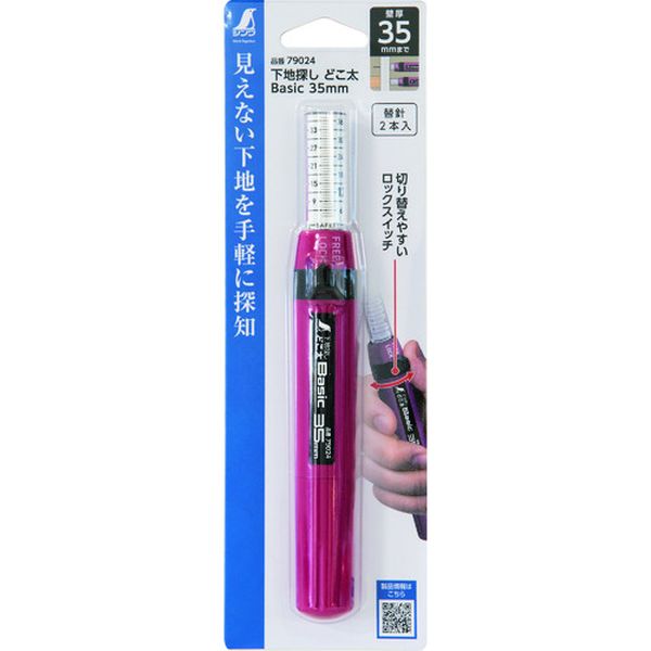 ・従来品よりも壁に刺した後、針が抜けにくくなっています。・しっかり握れて腰袋にも簡単に入るサイズです。・大型ロックスイッチにより片手でロックの切り替えができます。・石膏ボード裏の下地探しに。・先端径(mm):22・全長(mm):170・探知壁厚(mm):35・タイプ:針探知・測定範囲:35mm・適合替針:79022・マグネット:なし・色:ピンク・針探知・本体:ABS樹脂・可動カバー:ポリカーボネート樹脂、ABS樹脂、スレンレス、黄銅・針:ステンレス・先端が針になっていますので取り扱いにご注意ください。・生産国 中国・JANコード 4960910790247・質量 37g・コード:203-6416 ・品目:79024