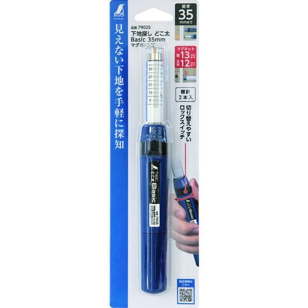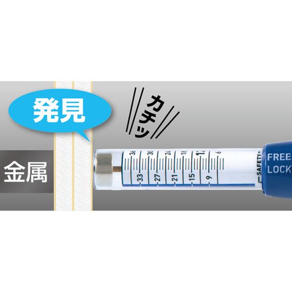 ・従来品よりも壁に刺した後、針が抜けにくくなっています。・しっかり握れて腰袋にも簡単に入るサイズです。・大型ロックスイッチにより片手でロックの切り替えができます。・マグネットで金属の下地を探せます。・石膏ボード裏の下地探しに。・先端径(mm):22・全長(mm):189・探知壁厚(mm):35・タイプ:針+マグネット探知・測定範囲:35mm・適合替針:79022・マグネット:あり・色:青・針+マグネット探知・磁石探知可能壁厚:13mm、天井厚:12mm・本体:ABS樹脂・可動カバー:ポリカーボネート樹脂、ABS樹脂、スレンレス、黄銅、ネオジム磁石・針:ステンレス・先端が針になっていますので取り扱いにご注意ください。・生産国 中国・JANコード 4960910790254・質量 41g・コード:203-6406 ・品目:79025
