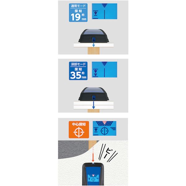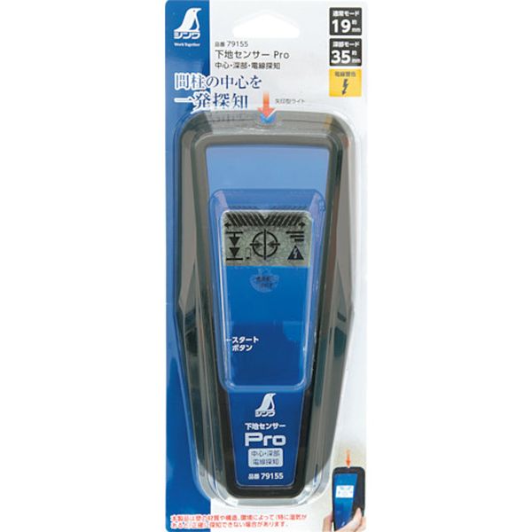 ・壁材に穴をあけることなく下地を探す事ができます。・ライトと液晶表示、ブザーで壁裏の見えない間柱をお知らせします。・下地材の中心を探知できます。・グリップ部は握りやすくすべりにくくなっています。・壁裏の見えない下地の探知。・幅(mm):98・高さ(mm):250・厚さ(mm):50・探知壁厚金属:35mm・電源:9Vアルカリ乾電池×1本(付属)・最大測定深度:通常モード約19mm、深部モード約35mm・電線警告機能:○・中心探知機能:○・タイプ:液晶、中心・深部・電線探知・電源(V):9Vアルカリ乾電池×1本(付属)・使用できる壁材:ベニヤ板・石膏ボード・強化石膏ボード・探知物:木材・金属の探知が可能(識別不可)・液晶モデル・電線警告機能付・電線探知深度:30mm・バックライト付・本体:ABS樹脂・エラストマー樹脂・9Vアルカリ乾電池×1本・環境によっては探知できない事があります。・壁が湿気を含んでいると、正確に探知できません。・生産国 中国・JANコード 4960910791558・質量 260g・コード:255-3755 ・品目:79155