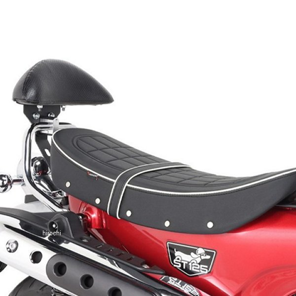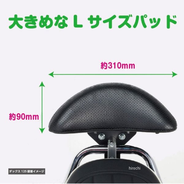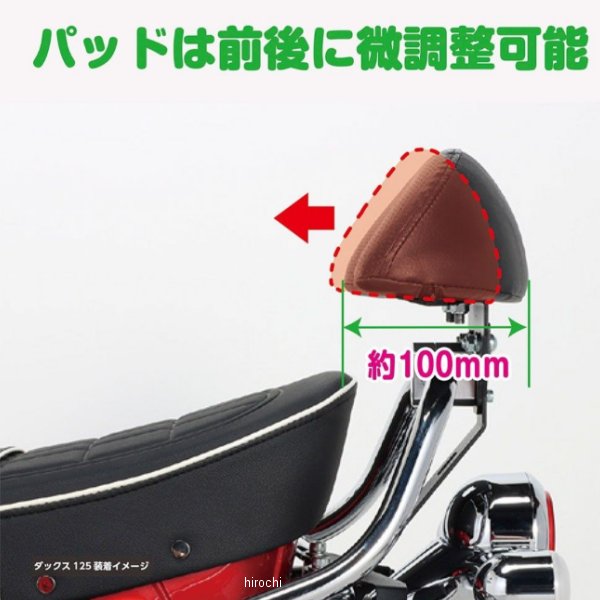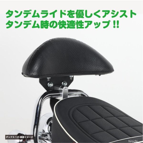 キタコ タンデムバックレストキット23年-25年 ホンダ ダックス125ノーマルグラブバー用ステー:スチール製ブラック塗装パッド:ディンプルメッシュ仕様Lサイズパッド:幅310mm×高さ90mm×奥行100mmパッド位置前後スライド調整可能※キタコ製HIGHグラブバー (シルバー:80-653-13200 / ブラック:80-653-13201) との併用はできません。※下記のキタコ製品と併用可。〇ヘルメットホルダー (80-564-13200)〇サイドバックサポート (80-655-13201)二人乗車時でも安心して走行できるバックレストです。