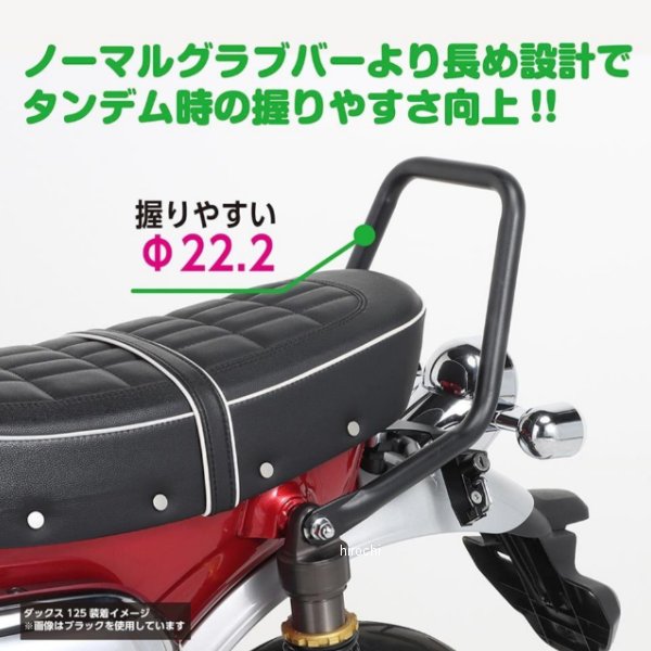 キタコ HIGHグラブバー23年-25年 ホンダ ダックス125カラー:メッキステンレス製バフ仕上げグラブバー共締めで装着。※ノーマルリヤキャリアーと併用不可。下記のキタコ製品と併用可。〇ヘルメットホルダー (80-564-13200)〇サイドバックサポート (80-655-13201)車体の取り回しにも便利な、リヤ周りを引き締めるグラブバーです。ノーマルグラブバーよりも長め設計で、タンデム時の握りやすさが向上します。