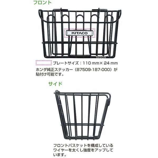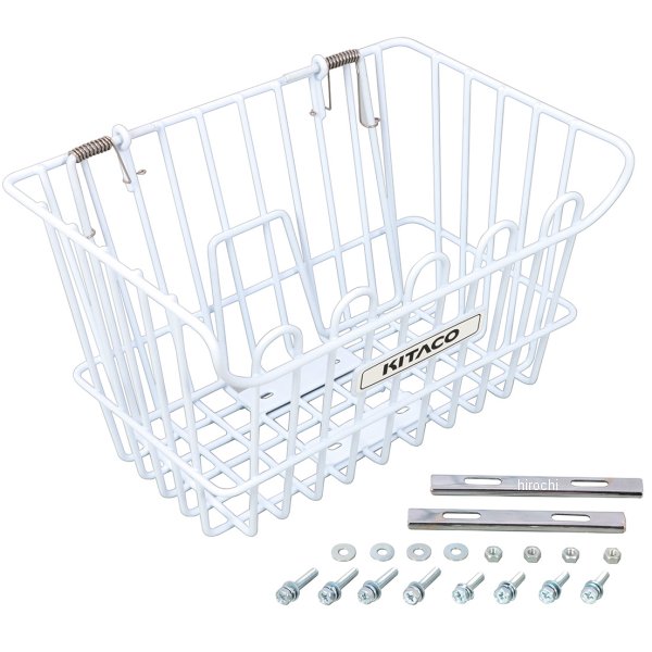 キタコ フロントバスケット汎用カラー:ホワイト素材:スチール製、樹脂コーティング【バスケットサイズ】開口部:336mm×240mm底部:286mm×146mm深さ:200mm重量:約1.6kg(ステー込み)取付けボルト、ステー類付属【仕様説明】フロントキャリアー用オプションアイテム。レインスーツ等の小物を入れることが可能で、バネ式荷物押さえバーが荷物の飛び出しを防ぎます。※過度の積載は安定性に大きな影響が出ますので、積載量の範囲内でも注意してご使用ください。※積載物は落下しないように紐または、荷物押さえバーで固定して下さい。
