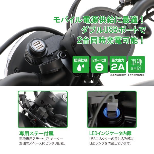 80-757-18620 キタコ USB電源KIT 23年 ホンダ レブル23年 ホンダ レブル 500モバイル電源供給に最適な2ポートタイプのUSB電源に専用ハーネスを付属した車種専用タイプです。※完全防水ではありません。洗車・雨天時は使用しないで下さい。また使用しないときは付属のゴムキャップを必ず装着してください。USBポート:1,000mA×2個○DC5V 最大出力:2,000mA(1ポートのみ使用の場合)○防滴仕様○LED内蔵(ブルー)※付属リレー取り付けの為、フューエルタンクの脱着作業が必要です。