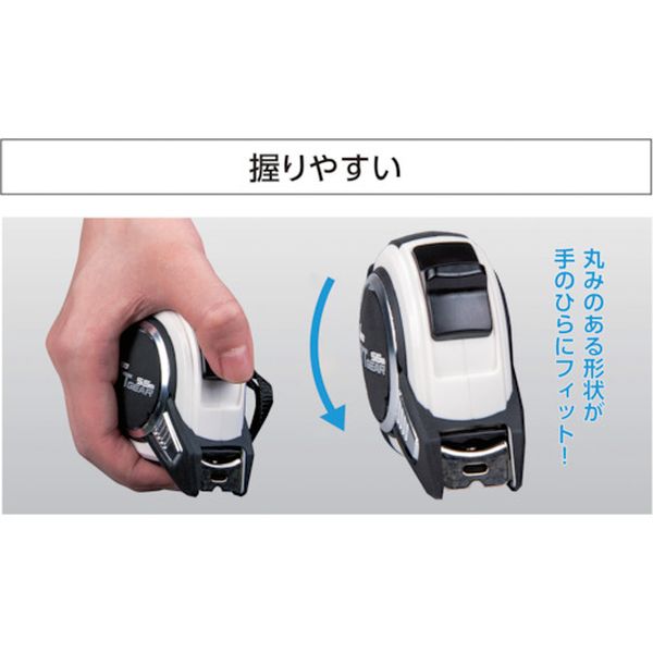 ・摩耗に強く、傷付きにくいナイロンコートテープを採用しました。・立体的な形状で手のひらにフィットします。・455mmピッチ表示付です。・大型フックハンガーで、落下防止コードの取り付けに便利です。・ショックアブソーバー(衝撃吸収材)付でテープ引き込み時の衝撃を軽減します。・ベルトクリップとストラップ付です。・テープ長さ(m):5.5・テープ幅(mm):19・水平保持(m):1.8・目盛仕様:両面目盛・JIS1級 両面目盛 ナイロンコート・爪ガード付・0点補正移動爪付・両面目盛付・テープ・炭素工具鋼(SK)・生産国 中国・JANコード 4960910805293・質量 225g・コード:536-8401 ・品目:80529