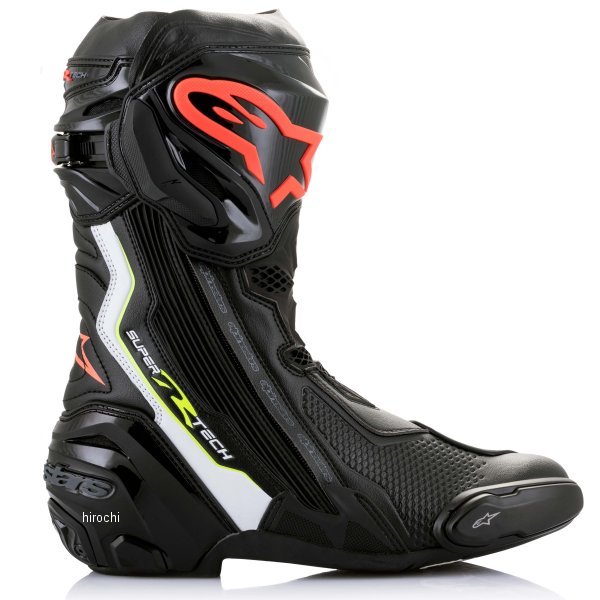 アルパインスターズ スーパーテックRブーツサイズ:42カラー: 1236 ブラック/ホワイト/レッドフロー/イエローフロー【仕様説明】・世界中のTOPライダーに愛用されるプレミアムレーシングブーツ。・耐久性の高いマイクロファイバーを主素材とし、内側にはフルレングスのスエードマイクロファイバーパネルによる安心感のあるグリップを提供。・柔軟性の高いメッシュラバー採用により、スムーズな操作性を実現。・人間工学に基づき、足形状に合わせてフィットする大型ラバーシャーリングを採用。・3Dメッシュ素材で再構築された独立したインナーブーティは、バイオメカニカルアンクルブレースを採用し内側から足首を保護。・新開発のラバーシフトパッドを採用し、従来よりインナーとアウターのズレを軽減しダイレクトで快適な操作性を実現。・スライダー交換可能。・CE規格
