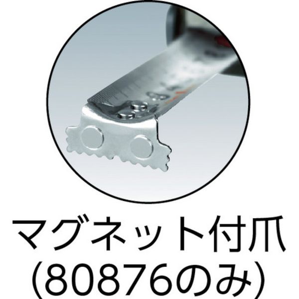 ・衝撃吸収プロテクターを装備しています。・長寿命ナイロンコートテープ仕様です。・落下防止コードが取り付け可能です。・テープ長さ(m):5.5・テープ幅(mm):25・水平保持(m):2.35・目盛仕様:cm・爪仕様:マグネット爪・0点補正移動爪:有り・455ピッチ表示:有り・ショックアブソーバー:あり・移動爪・ロックタイプ・JIS1級・両面目盛・455mmピッチ表示:あり・減速ボタン:なし・ショックアブソーバー:あり・ベルトフック付・テープ:スチール・本体:ABS樹脂・爪、ベルトクリップ:ステンレス・ストラップ:軟質塩化ビニール・精度を要する測定には使用しないでください。・生産国 中国・JANコード 4960910808768・質量 314g・コード:444-3179 ・品目:80876
