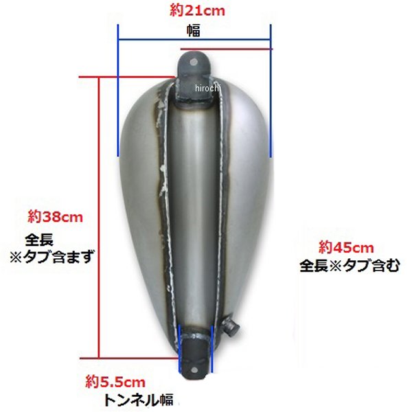 ガッツクローム ナローチョッパータンク横幅約21cm 長さ(タブ含む)約45cm容量:約8.2Lコックは左後方、1/4サイズキャップはカムタイプです。※ご使用、加工の前には必ずガソリン漏れしないかご確認下さい。また、タンク内コーティングを行ってからご使用ください。※2500-1003 スモールガスキャップは口径が異なる為使用できません。