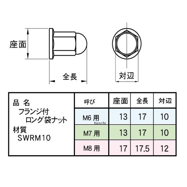 ポッシュ(POSH) フランジ付ロング袋ナットネジ径:6mmピッチ:1.0mm座面:φ13mm全長:17mm対辺:10mm表面処理:硬質クロムメッキ数量:2個入り