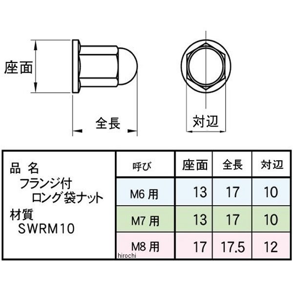 ポッシュ(POSH) フランジ付ロング袋ナットネジ径:8mmピッチ:1.25mm座面:φ17mm全長:17.5mm対辺:12mm表面処理:硬質クロムメッキ数量:2個入り