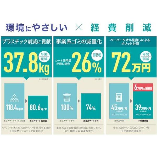 ・紙パッケージで使用プラスチック量を約30%削減。・小判サイズだから、一般的な中判サイズと比較して使用する資源と使用後のゴミ量を削減。・回収原材料を100%使用したFSC認証。・手拭き・拭き取り・シートサイズ(mm):170×210・ケース入数:200枚×42パック・再生紙・紙包装タイプ・生産国 日本・JANコード 4902011826715・質量 9.800kg・コード:436-2108 ・品目:823671
