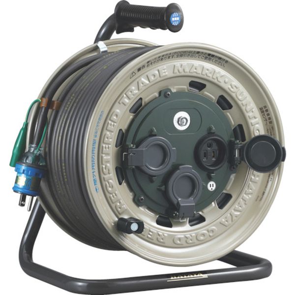 ・サンタイガーリールの屋外仕様タイプです。・水だけでなく粉じんの侵入も防ぎます。・円盤の汚れ付着防止の防泥カバー付です。・温度センサー内蔵です。(自動復帰型)・屋外の工事現場で。・屋外の機器使用。・イベントなどの電源用。・電線種:VCTソフトムケーブル・電線仕様長さ(m):50・電線仕様太さ([[MM2]]):2.0・電線仕様芯数(C):2・定格電流(A):5・コンセント仕様定格:2P・15A・125V・コンセント仕様形状:[[二相2]]・コンセント仕様個数:3・温度センサー:○・通電ランプ:○・定格電圧(V):125・電線溶解防止機能:○・パイロットランプ:○・AC100V・防雨型コンセントキャップ・防泥カバー付・製品定格:125V・5A・温度センサー内蔵・鉄板・受注生産品・生産国 日本・JANコード 4930510127316・質量 9.900kg・コード:851-3820 ・品目:GX50