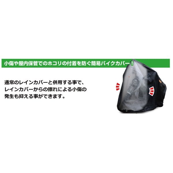 キタコ KITACO バイクカバー 不織布汎用サイズ:210×65×130cmポリプロピレン製※通気性のある素材を使用していますので、防水効果はありません。※エンジン、マフラーが熱い状態での使用はカバー変質の恐れがあるため、使用しないで下さい。屋内長期保管や屋外工事等で発生するホコリや塵から車体を保護する柔らかい不織布カバー。通常のバイクカバーと併用する事で、カバーの擦れから発生する小傷を防ぐことにも最適です。