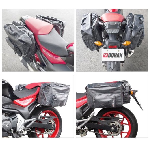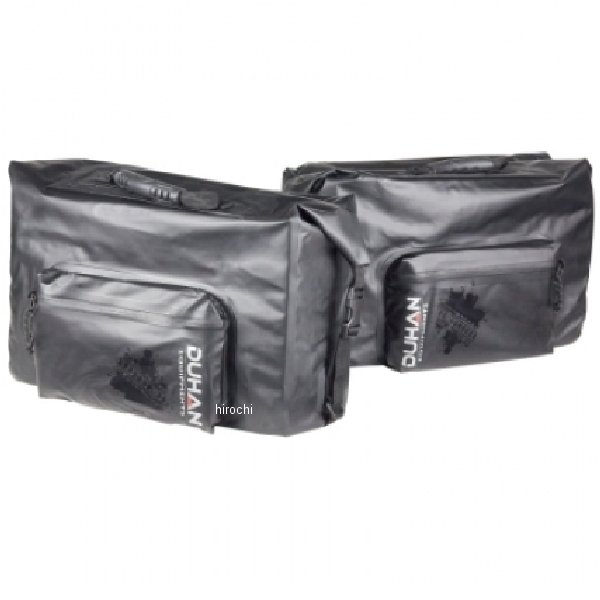 ドゥーハン DUHAN 防水サドルバッグサイズ:全長(45cm)・横幅(30cm)・マチ(22cm)※1個あたり(片側)の容量です。左右合計では 36Lとなります。ナイロンにPVCコーティングを施した完全防水生地による縫製に加え、ポケット部には止水ファスナーを標準装備とすることで、極めて高度な防水性能を確立折り曲げた開口部を左右バックルで固定することにより、一層の防水性能を高めました。側面には高い防水性能を誇る止水ファスナーを採用したポケットを装備し、小物の出し入れに最適です。左右バックは、着脱可能な大面績のベルクロテープによる接続+ストラップによる車体への固定左右合計、 36 L もの大容量を確保しつつ、開口部には荷物の出し入れがしやすいロールトップ式を採用