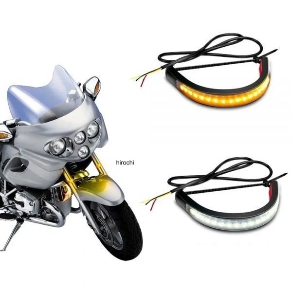 NBS バイクパーツセンター LEDライト フロントフォーク ※ドレスアップ商品としてご使用ください。ラバー素材の為よく曲がるので、湾曲した箇所にも設置可能。粘着テープと結束バンドでしっかりと固定できます。バイクのフロントフォークに取付可能のデイライト&流れるシーケンシャルウインカーです。両面テープとインシュロックで取り付けますのでフロントフォーク以外にも様々な場所へ取付可能です。高輝度のLEDを使用していますのでデイライト、ウインカーともに視認性は抜群です。バイクにおいては視認性は安全面でも重要と言われ、デイライトやウインカーで他車に存在を知らせるということは大切です。フロントフォークデイライトシーケンシャルウインカーは実用性とドレスアップ機能を兼ね備えたアイテムです。オートバイのライトバーはより安全性を高めます。非常に明るく広角に照らします。【2パターンの点灯】通常のホワイトのカラーと、方向指示のようにイエローのカラーで点滅する2パターンの機能デイライト、シーケンシャルウインカー(ウインカー動作時は、デイライトは自動消灯)視認性を高める効果とドレスアップにも最適です。【低消費LED】低消費のLEDライト、平均寿命約80,000時間【防水】 防水仕様なので安心してお使い頂けます。このオートバイのテールライトは、3線式接続、ランニングライト、ブレーキライト、ハザードライトと幅広く使用できます。バイク・車・自転車やスノーモービルに取り付けられ、ほとんどのタイプの車両に適しています。・サイズ約14cm×1.3mケーブル長 約45cm