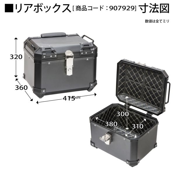 NBS バイクパーツセンター リアボックス 45L スクエアタイプ ブラック容量 45Lサイズ 外寸:奥行360x幅415x高さ320mm 内寸:奥行310x幅380x高さ300mm重量 約4.9kg 耐荷重 最大4.0kg特徴・鍵付きなので配達業務やでの貴重品の保管はもちろん、ヘルメットの収納も可能な大容量のリアボックスです。・内装は高級感とクッション性の高いダイヤカットデザインのPVCレザー。実用性と装飾性を兼ね備えたボックスです。※キャリア本体の積載制限以上は積載しないでください。※防水性を考慮した設計をしておりますが、完全防水ではありません。