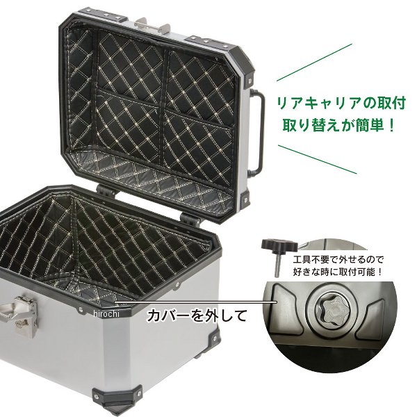 【商品詳細商品カラー:シルバーヘルメットの収納も可能な大容量リアボックスです。鍵付きなので防犯対策もできます。内装は高級感とクッション性の高いダイヤカットデザインのPVCレザー。実用性と装飾性を兼ね備えたボックスです。【注意事項】・キャリア本体の積載制限以上は積載しないでください。・防水性を考慮した設計をしておりますが、完全防水ではありません。【サイズ】容量:45L外寸:縦36cm x 横 41.5cm 高さ 32cm内寸:縦31cm x 横 38cm 高さ 30cm