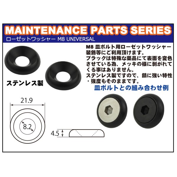 ポッシュ POSH ローゼットワッシャー M8皿ボルト用カラー:ブラックサイズ:外径21.9mm、厚さ4.5mm、内径8.2mm2個入りステンレス製M8皿ボルト用【仕様説明】M8皿ボルト用ローゼットワッシャー装飾等にご利用頂けます。ブラックは特殊な薬品にて表面を変色させている為、メッキの様に剥がれてくる事は有りません。ステンレス製ですので、錆に強い特性・強度もそのままです。