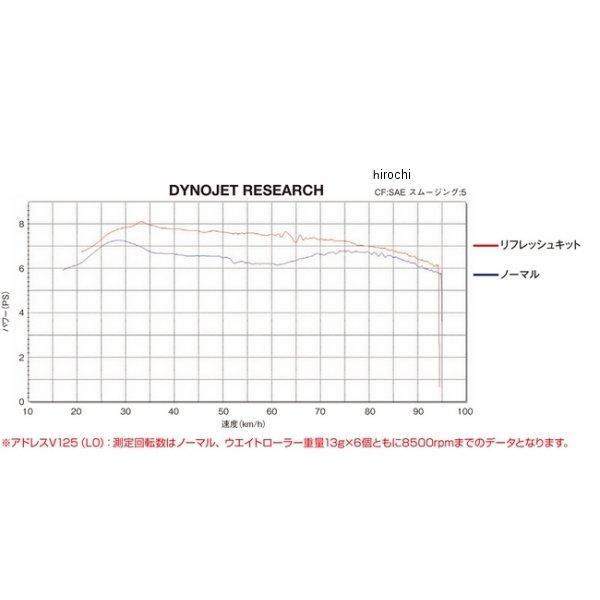リフレッシュキットタイプ1です。05年-07年 スズキ アドレスV12510年-17年 スズキ アドレスV125S10年 スズキ アドレスV125S ベーシックウエイトローラー:13g×6個付属ベルトの耐久性向上のため慣らし運転を50-100km程してください。所定の幅寸法から1mm以上減がVベルト使用限度です。損耗状態を定期的に確認し、適切なタイミングで新品交換してください。他社製品など、デイトナ指定商品以外の組み合わせは未確認(保証対象外)です。リプレイス+α=リフレッシュで加速性能UPスクーターの駆動系において1万km程度の走行で消耗する部品を1パッケージにまとめた商品基本的な商品内容はクランクケースカバーガスケット、DWRウエイトローラー、スライドピース、ドリブンのピンとカラー、Oリング、強化Vベルト(車種により若干異なります)です。上記部品がへたると最高速、加速がダウンしますので、交換することによって性能が蘇ります。さらにウエイトローラーの重量設定をベストセッティング重量とすることで加速性能が向 します。