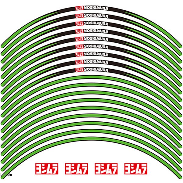 ヨシムラ リムステッカーTYPE-Aホイールサイズ:17インチカラー:グリーン【仕様説明】・ステッカーライン幅:7mm・UVカット加工・貼りやすい片面4分割タイプ・車両1台分=18枚入り(前後左右の計4面分 16枚+予備2枚)・ヨシムラロゴ4枚(ホイールの形状によっては貼れない場合がございます)・位置決めの際の貼り直しが行いやすく、シワにもなりにくい厚手のシートを採用。