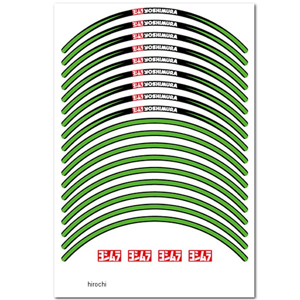 ヨシムラ リムステッカー TYPE-A適合ホイールサイズ:12インチカラー:グリーンステッカーライン幅:7mmUVカット加工貼りやすい片面4分割タイプ車両1台分=18枚入り(前後左右の計4面分 16枚+予備2枚)ヨシムラロゴ4枚(ホイールの形状によっては貼れない場合がございます)位置決めの際の貼り直しが行いやすく、シワにもなりにくい厚手のシートを採用。