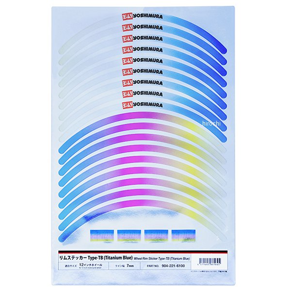ヨシムラ リムステッカーTYPE-TB適合ホイールサイズ:12インチステッカーライン幅:7mmUVカット加工貼りやすい片面4分割タイプ車両1台分=18枚入り(前後左右の計4面分 16枚+予備2枚)ヨシムラロゴ4枚(ホイールの形状によっては貼れない場合がございます)位置決めの際の貼り直しが行いやすく、シワにもなりにくい厚手のシートを採用。ヨシムラサイクロンのチタンブルーカバーをイメージしたリムステッカーです。金属のように光沢のあるメタリックシートに透明感のあるグラデーションを再現。鮮やかでスタイリッシュな印象を与えます。