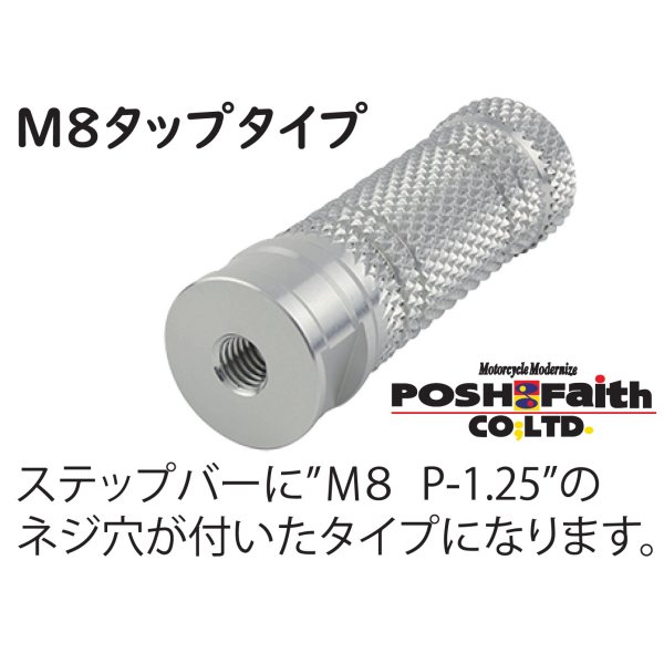 ポッシュ POSH アルミマシンドステップバーローレット [エグリ] M8タップ タイプカラー:ゴールドアルミ削り出し/アルマイト仕上げ2本入り樹脂製エンド付属日本製【仕様説明】アルミ削り出しのステップバー、バックステップの補修やドレスアップ等にご利用ください。ローレットタイプは細かいエッジの効いたローレット加工を施しライダーの足元をしっかりとしたグリップ力でサポートします。ラインナップは表面仕上げ2種[ローレット][モールド]、ステップ形状2種[ストレート][エグリ]、取り付け部分2種[M8貫通穴] [M8タップ]タイプをご用意しています。