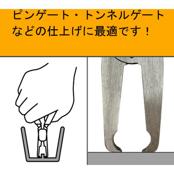 ・刃が先端部に直角についているので、ゲートをまたいでの切断や奥まった場所のゲートの切断が可能です。・軟質樹脂のピンゲート・トンネルゲートなどの切断に最適です。・作業性の良いバネ付タイプです。・交換用バネはFNS-14(5本入り)です。・プラモデル・プラスチック成形品のゲート切断・バリ取りに。・全長(mm):142・切断能力(mm)樹脂:φ3・ストレート刃・ばね付・ソフトカバー付・抗菌グリップ・ROHS対応・刃部鏡面仕上げ・刃幅:10mm・特殊鋼・グリップ:樹脂・No.9-125、No.91-125の後継品です。・能力以上の使用はしないで下さい。・電気が流れている物への切断は絶対にしないで下さい。・生産国 日本・JANコード 4952520091012・質量 100g・コード:344-4058 ・品目:910150