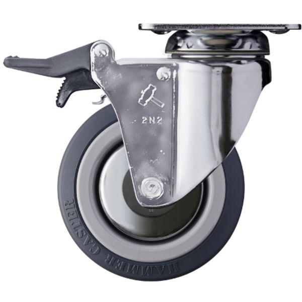 ・車輪径D(mm):100・タイプ:自在式(ストッパー付・トータルロック)・許容荷重(daN):100・車輪幅(mm):32・取付高H(mm):137・取付座A(mm):85・取付座B(mm):85・取付ピッチX(mm):52(62)・取付ピッチY(mm):52(62)・取付穴径P(mm):8.8・V:114mm・K:8mm・偏心(E):32mm・旋回半径:114mm・車輪品種:434M-KUB・プレート式・本体:スチール・表面処理:クロームメッキ・車輪:ウレタン・生産国 日本・JANコード 4956237022987・質量 953g・コード:814-0692 ・品目:915MKUB100