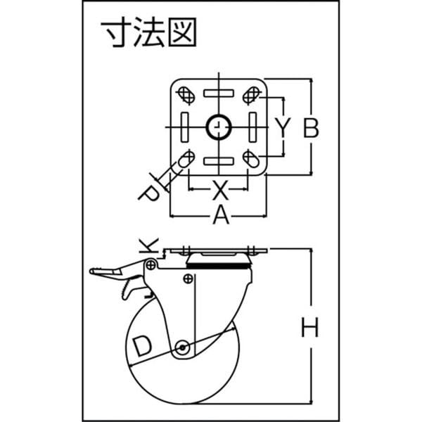 ・旋回部のボールレース径が大きく、幅広車輪の採用で旋回性能、走行安定性が抜群のキャスターです。・医療機器・理化学機器の分野で広く使用されています。・車輪径D(mm):100・タイプ:自在式(ダブルストッパー付)・許容荷重(daN):100・許容荷重(kgf):102・車輪幅(mm):32・取付高H(mm):137・取付座A(mm):85・取付座B(mm):85・取付ピッチX(mm):52~62・取付ピッチY(mm):52~62・取付穴径P(mm):8.8・プレート式・自在式(ダブルストッパー付)・旋回部と車輪を同時にロック・金具:スチール・金具表面処理:クロームメッキ仕上げ・車輪:ナイロンホイール、ゴム・生産国 日本・JANコード 4956237022925・質量 988g・コード:398-5016 ・品目:915MRB100