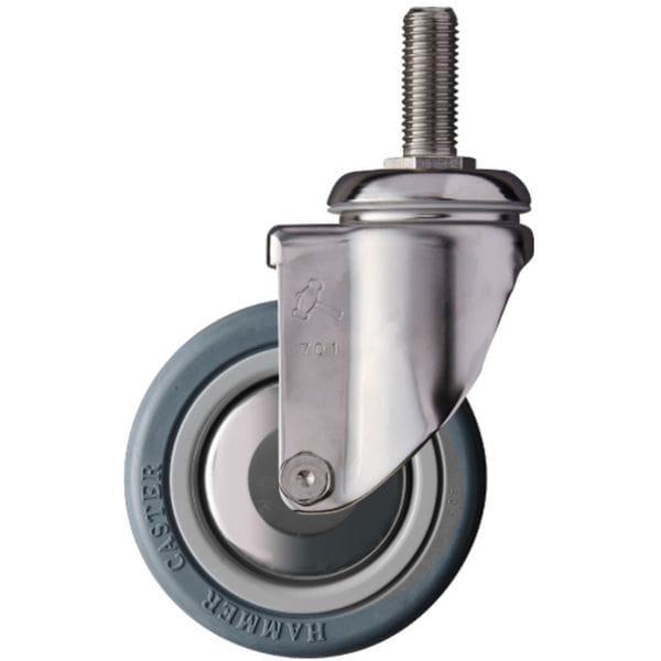 ・耐蝕性・耐水性に優れ、研ぎ澄まされた外観を持つオールステンレスキャスターです。・使用例:医療関係や食品会社等の錆や腐蝕をきらう環境で使用される機器等に最適です。・車輪径D(mm):100・タイプ:自在式・許容荷重(daN):100・車輪幅(mm):32・取付高H(mm):138・軸長L(mm):40・ねじT:M16・ねじピッチ(mm):2.0・偏心(E)(mm):32・旋回半径(mm):83・車輪品種:434S0M-KUB100・スパナ(mm):23・SUS ねじ込み ゴムB車100mm・金具:ステンレス・車輪:ゴム・生産国 日本・JANコード 4956237436777・質量 795g・コード:337-6244 ・品目:920SMARB100