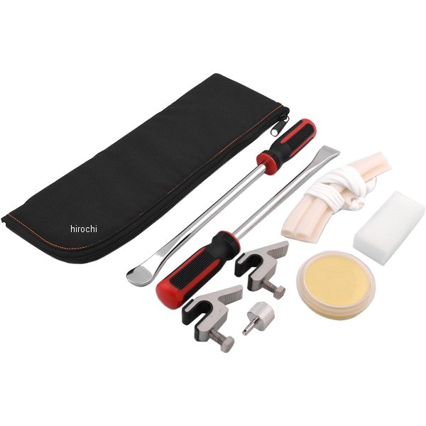 タイヤレバーセットオールインワンです。収納ケース寸法:縦325mm x 横120mmレバー全長300mm x 2(グリップ90mm)ポリウレタン樹脂プロテクター x 2バルブコア回し x 1ビードワックス40g x 1ビードダウンキーパー x 2収納ポーチ x 1人気のタイヤレバーセットにタイヤ交換が楽になるビードダウンキーパーやコンパクトなバルブコア回し、ビードワックス40gなど必要な工具を追加セットしたオールインワンキット