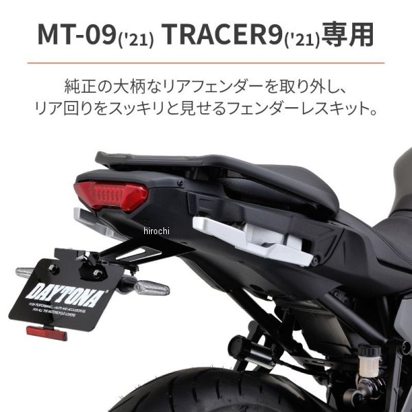 デイトナ LEDフェンダーレスキット(車検対応LEDライセンスランプ付き)21年-23年 ヤマハ MT-09 ABS21年-24年 ヤマハ TRACER9GT ABS22年-24年 ヤマハ XSR900新保安基準適合付属品:LEDライセンスランプ&リフレクター&ウインカーステー取付作業時間目安:1.0hスタイリッシュなリア回りを演出するフェンダーレスキット。純正ウインカーが無加工で装着できます。ナンバー取付角度は2021年度新基準をクリアした40度に設計。車検対応LEDライセンスランプ、スリムリフレクターも同梱。取り付けに必要な全ての部品が入った保安基準適合のボルトオン、カプラーオンキットです。※メーカー都合により商品の仕様変更がある場合がございます。ご了承ください。